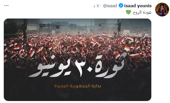 حرصت الفنانة إسعاد يونس، على إحياء الذكرى الثامنة لثورة 30 يوينو، معربة عن سعادتها وفخرها بهذه الثروة، ومتمنية من الله أن يحفظ مصر وشعبها.