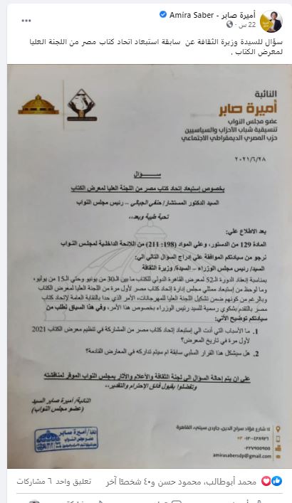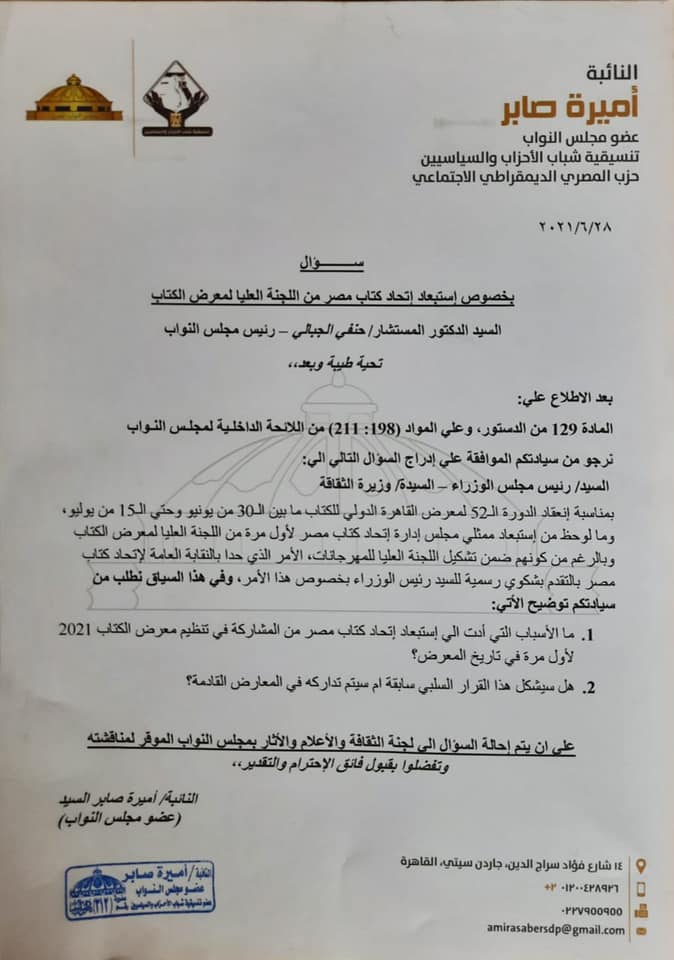 تقدمت النائبة أميرة صابر، عضو مجلس النواب، بطلب إلى رئيس المجلس المستشار حنفي الجبالي تطلب فيه سؤال رئيس مجلس الوزراء مصطفى مدبولي، ووزيرة الثقافة إيناس عبد الدايم، بشأن استبعاد اتحاد كتاب مصر من المشاركة في تنظيم معرض القاهرة الدولي للكتاب.