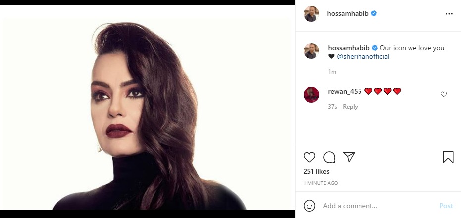 ونشر حبيب صورة لشريهان، عبر حسابه الرسمي تبادل الصور والفيديوهات الشهير "انستجرام"، وعلق عليها قائلة: "الأيقونة بتاعتنا.. بنحبك".