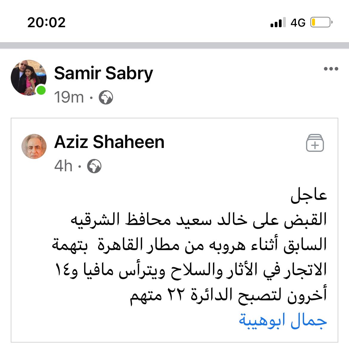 وكان مستخدمو مواقع التواصل قد أكدوا خبر القبض على خالد سعيد محافظ الشرقية الأسبق، وذلك أثناء إنهاء إجراءات سفره خارج البلاد في مطار القاهرة الدولي، لاتهامه بالاتجار في الآثار والسلاح، وتزعم عصابة تعمل على التنقيب في الآثار وتهريبها.