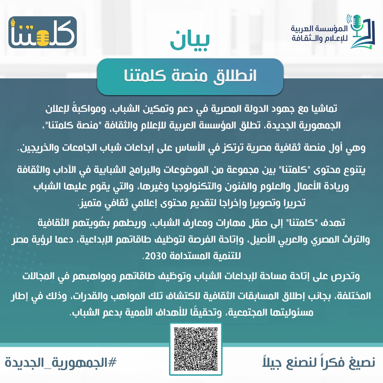 أطلقت المؤسسة العربية للإعلام والثقافة منصة "كلمتنا"، أول منصة ثقافية مصرية ترتكز في عملها على إبداعات شباب الجامعات والخريجين، والنماذج المتميزة من الشباب المصري والعربي، تماشيًا مع جهود الدولة المصرية في دعم وتمكين الشباب، وفقًا لبيان المؤسسة.