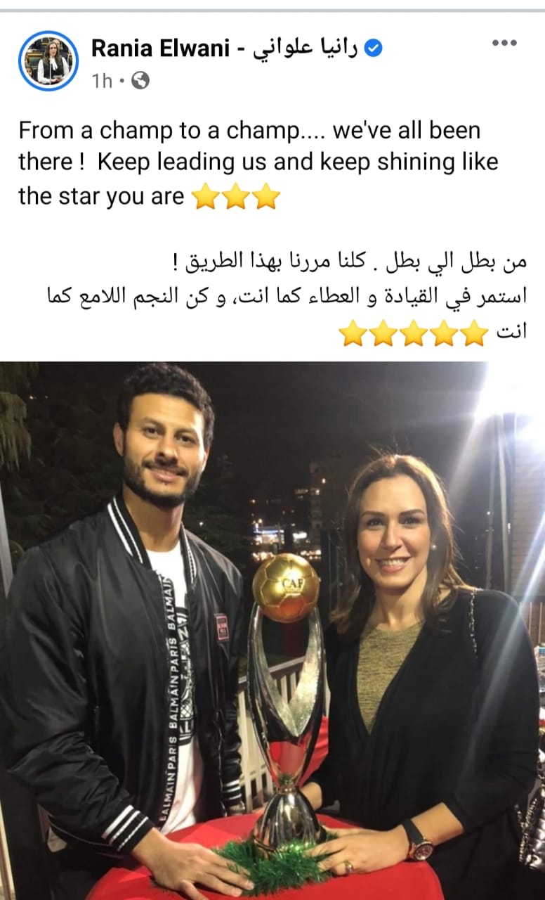 كما شاركت رانيا علواني، عضو مجلس إدارة القلعة الحمراء، صورة لها تجمعها مع الشناوي وعلقت عليها: "من بطل إلى بطل.. كلنا مررنا بهذا الطريق، استمر في القيادة والعطاء كما أنت، وكن النجم اللامع كما أنت".