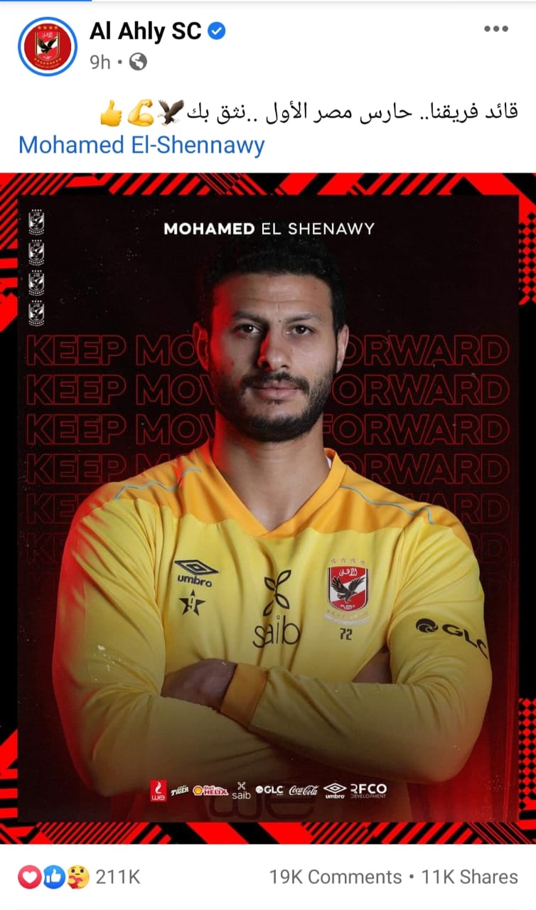 ونشر النادي الأهلي عبر جميع حساباته الرسمية على التواصل الاجتماعي، صورة لمحمد الشناوي وعلق عليها: "قائد فريقنا.. حارس مصر الأول.. نثق بك”.