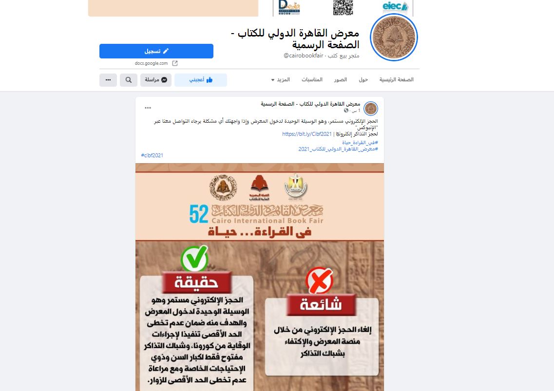 نفت الصفحة الرسمية لمعرض القاهرة الدولي للكتاب على “فيسبوك”، شائعة إلغاء الحجز الإلكتروني للتذاكر، مؤكدة أن الحجز الإلكترون هو الوسيلة الوحيدة للدخول بهدف ضمان عدم تخطي الحد الأقصى تنفيذا لإجراءات الوقاية من كورونا، وشباك التذاكر مفتوح فقط لكبار السن وذوي الاحتياجات الخاصة مع مراعاة عدم تخطي الحد الأقصى للحجز.