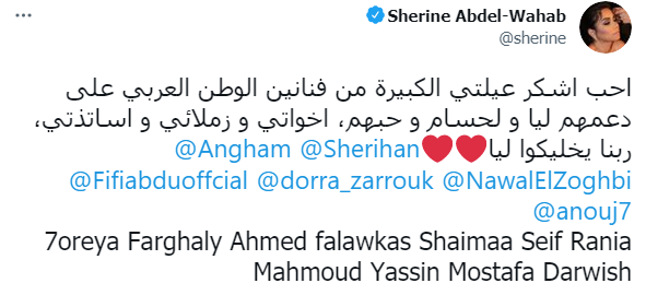 وكتبت شيرين في تغريدة عبر حسابها الرسمي بموقع التغريدات “تويتر": “أحب أشكر عائلتي الكبيرة من فنانين الوطن العربي، على دعمهم ليا ولحسام وحبهم، إخواتي وزملائي وأساتذتي، ربنا يخليكوا ليا”.