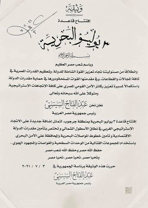 نشر السفير بسام راضي المتحدث باسم رئاسة الجمهورية، صورة لتوقيع الرئيس عبدالفتاح السيسي، على وثيقة إنشاء قاعدة 3 يوليو البحرية، التي تم افتتاحها اليوم السبت.
