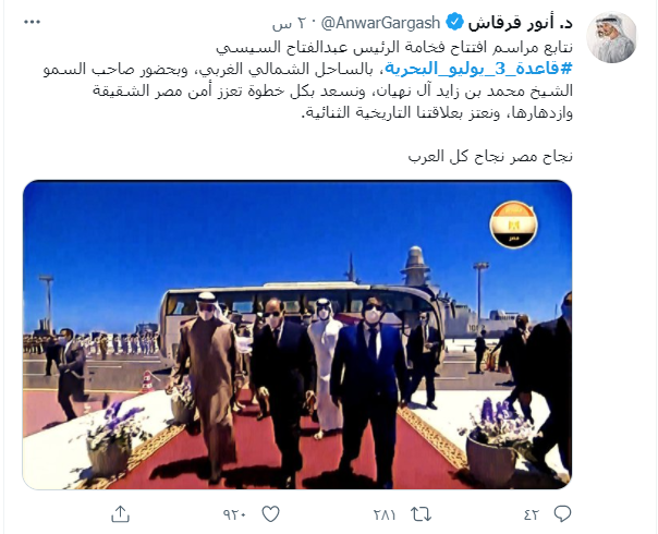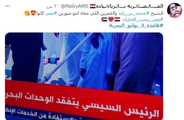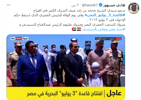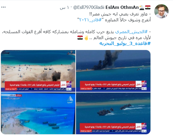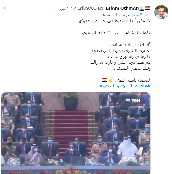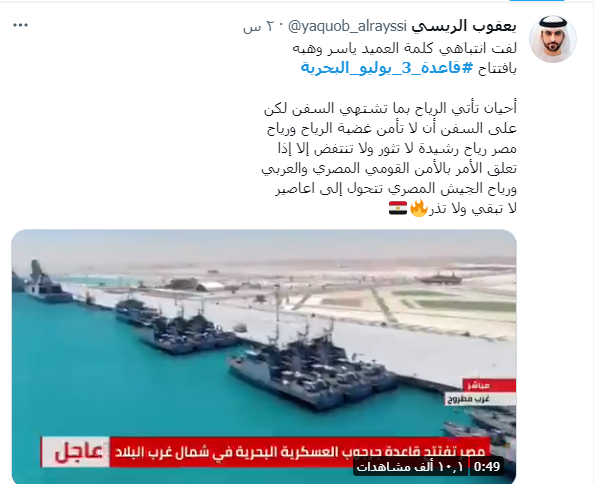 وقال أحد المغردين: "لفت انتباهي كلمة العميد ياسر وهبة بافتتاح قاعدة 3 يوليو البحرية، أحيانًا تأتي الرياح بما تشتهي السفن لكن على السفن أن لا تأمن غضبة الرياح".