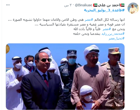 وتابعت التغريدة: "ورياح مصر رياح رشيدة لا تثور ولا تنتفض إلا إذا تعلق الأمر بالأمن القومي المصري والعربي ورياح الجيش المصري تتحول إلى أعاصير".