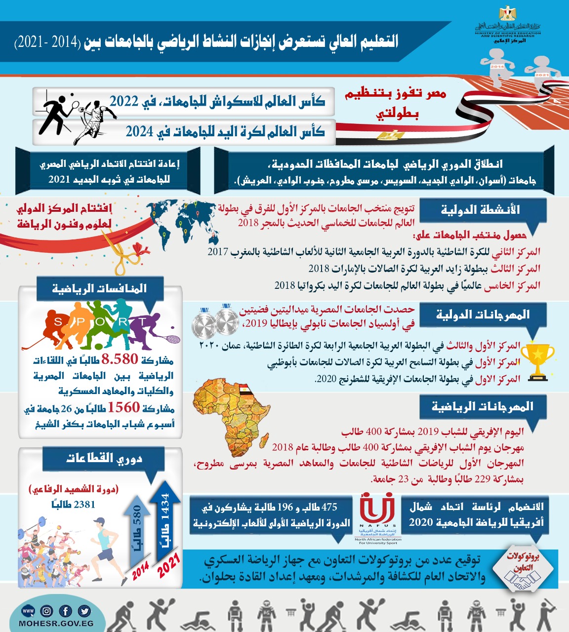 ونوه التقرير إلى إعادة افتتاح الاتحاد الرياضي المصري للجامعات في ثوبه الجديد 2021، وكذا افتتاح المركز الدولي لعلوم وفنون الرياضة، فضلًا عن الانضمام لرئاسة اتحاد شمال أفريقيا للرياضة الجامعية 2020، فضلًا عن توقيع عدد من بروتوكولات التعاون مع جهاز الرياضة العسكري والاتحاد العام للكشافة والمرشدات، ومعهد إعداد القادة بحلوان.