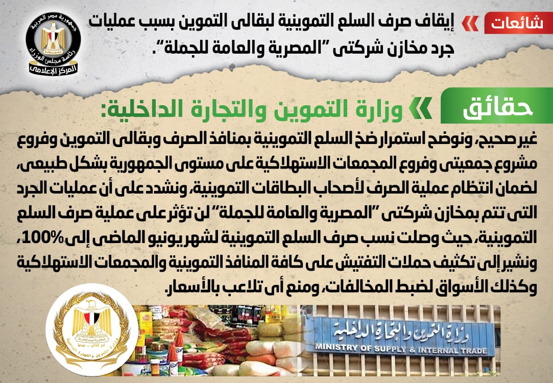 وتواصل المركز الإعلامي لمجلس الوزراء بالتواصل مع وزارة التموين والتجارة الداخلية، والتي نفت تلك الأنباء، مُؤكدةً أنه لا صحة لإيقاف صرف السلع التموينية لبقالي التموين بسبب عمليات جرد مخازن شركتي "المصرية والعامة للجملة".