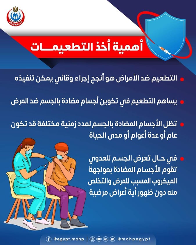 نشرت وزارة الصحة والسكان، عبر صفحتها الرسمية بموقع التواصل الاجتماعي “فيس بوك”، انفوجراف حول أهمية التطعيمات الخاصة بفيروس كورونا كوفيد-19.