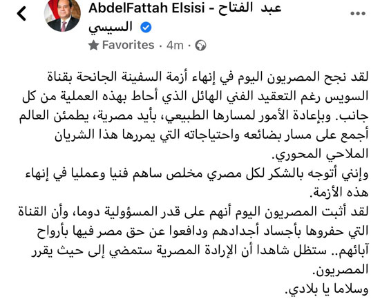 "لقد أثبت المصريون اليوم أنهم على قدر المسؤولية دوما، وأن القناة التي حفروها بأجساد أجدادهم ودافعوا عن حق مصر فيها بأرواح آبائهم.. ستظل شاهدا أن الإرادة المصرية ستمضي إلى حيث يقرر المصريون".. تغريدة في فجر يوم التاسع والعشرين من مارس الماضي طل فها الرئيس عبد الفتاح السيسي، معلنًا إنجازًا جديدًا شكل فخرا للمصريين فتحول الحدث إلى عيد، وتحولت الأزمة إلى فرحة عارمة شكلتها الأيادي العاملة المصرية.
