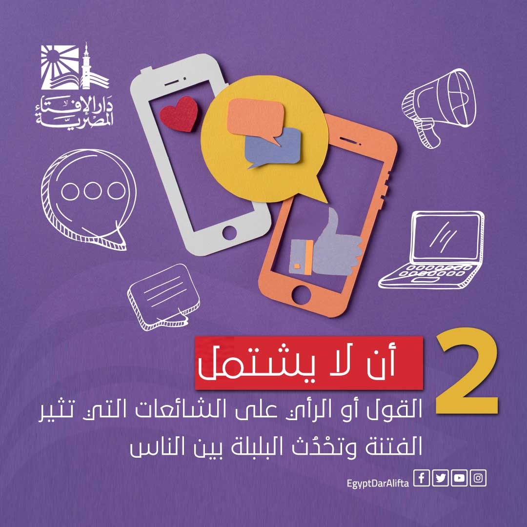 قالت دار الإفتاء المصرية في منشور لها عبر صفحتها الرسمية على موقع التواصل الاجتماعي “فيس بوك”، إن هناك ضوابط فى صورة 5 نصائح لأخلاقيات التعامل مع وسائل التواصل الاجتماعي.