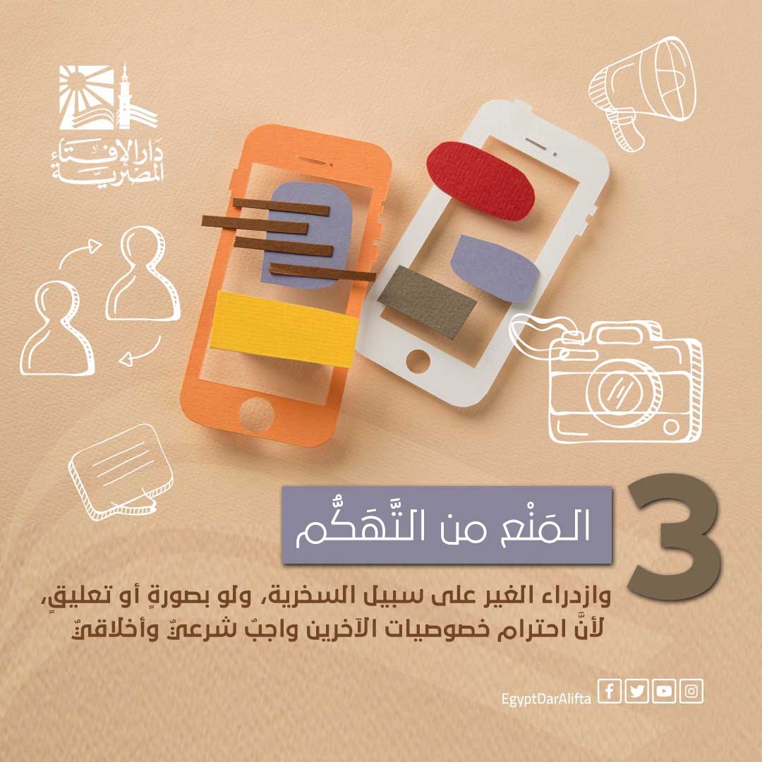 ثالثًا: الـمَنْع من التَّهَكُّم وازدراء الغير على سبيل السخرية، ولو بصورةٍ أو تعليقٍ، لأنَّ احترام خصوصيات الآخرين واجبٌ شرعيٌ وأخلاقيٌ، وقد قال تعالى في الآية الجامعة: {يَاأَيُّهَا الَّذِينَ آمَنُوا لَا يَسْخَرْ قَوْمٌ مِنْ قَوْمٍ عَسَى أَنْ يَكُونُوا خَيْرًا مِنْهُمْ وَلَا نِسَاءٌ مِنْ نِسَاءٍ عَسَى أَنْ يَكُنَّ خَيْرًا مِنْهُنَّ وَلَا تَلْمِزُوا أَنْفُسَكُمْ وَلَا تَنَابَزُوا بِالْأَلْقَابِ بِئْسَ الِاسْمُ الْفُسُوقُ بَعْدَ الْإِيمَانِ وَمَنْ لَمْ يَتُبْ فَأُولَئِكَ هُمُ الظَّالِمُونَ} [الحجرات: 11]