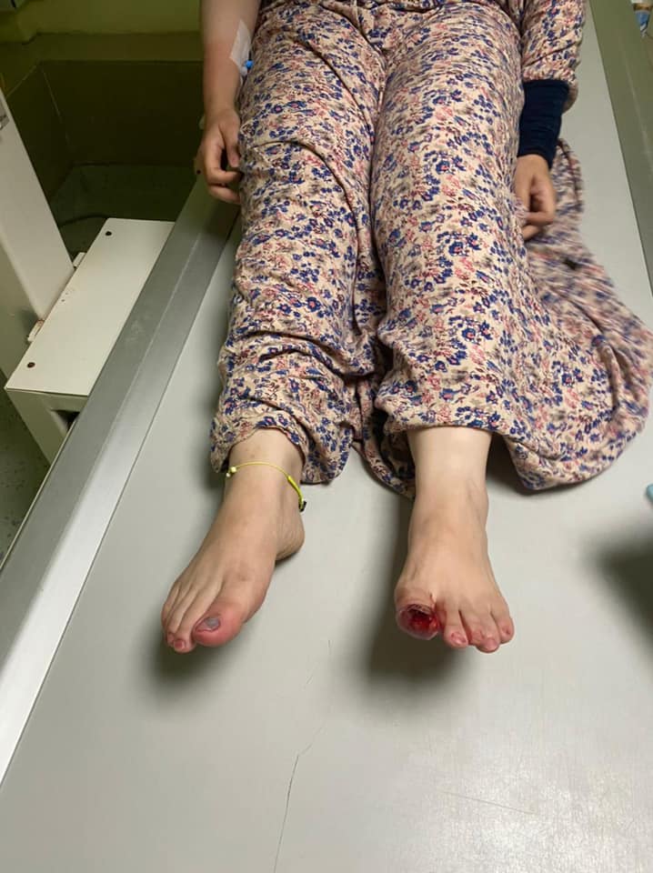 وأضافت: “إصبع قدمي الكبير تهتك وخضعت لعملية لإزالة الظُفر، وتعرض 4 أصابع للكسر، وأصابع قدمي الأخرى تعرضت للشروخ”.