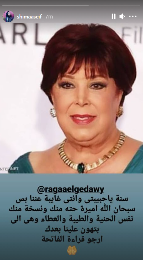 ونشرت شيماء سيف بحسابها الشخصي على "انستجرام" عبر خاصية "استوري"، صورة الفنانة الراحلة رجاء الجداوي وعلقت: "سنة يا حبيبتي وأنتِ غايبة عننا.. بس سبحان الله أميرة حتة منك ونسخة منك".