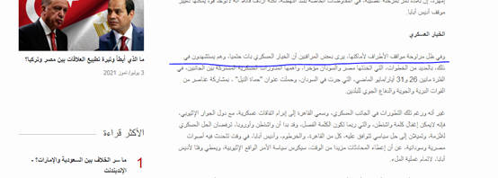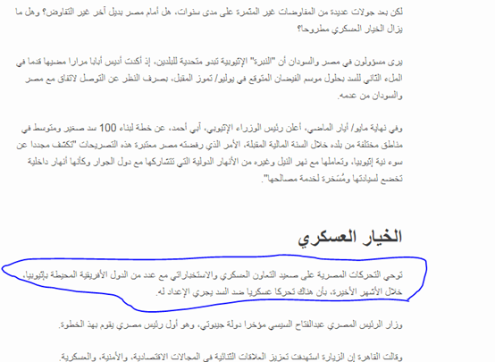 ثم مرورًا بالمسار القانوني والانسحاب من إعلان المبادئ انتهاءً باستمرار المفاوضات، وطرحت سؤالًا: لكن بعد جولات عديدة من المفاوضات غير المثمرة على مدى سنوات، هل أمام مصر بديل آخر غير التفاوض؟ وهل ما يزال الخيار العسكري مطروحًا؟ ورأت أن التحركات المصرية توحي على صعيد التعاون العسكري والاستخباراتي مع عدد من الدول الإفريقية المحيطة بإثيوبيا، خلال الأشهر الأخيرة، بأن هناك تحركًا عسكريًا ضد السد يجري الإعداد له.