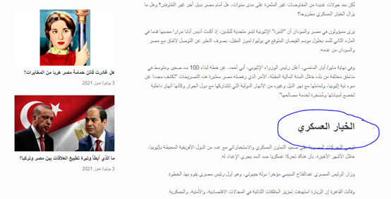 وفي عناوين سابقة لـ"بي بي سي" مثل: سد النهضة: "لا قوة" قادرة على تعطيل الملء الثاني للسد -الخارجية الإثيوبية بتاريخ (20 مايو 2021)، وسد النهضة: ما هي سيناريوهات حل الأزمة أمام مصر؟ (17 يونيو الماضي)، بدا جليًا أنها تدفع مصر للخيار العسكري، حيث بدأ العناوين الفرعية للتقرير باستخدام الخيار العسكري لحل القضية ثم ضرورة وجود ضوء أخضر من إدارة الرئيس الأمريكي جو بايدن، مع إثبات أنها لن تفعل شيئًا لمصر.
