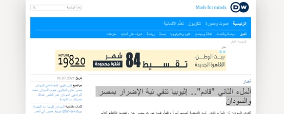 وتحت عنوان: الملء الثاني "قادم".. إثيوبيا تنفي نية الإضرار بمصر والسودان لدويتشه فيله "إذاعة صوت ألمانيا" رأت أن أزمة سد النهضة الإثيوبي وصلت إلى طريق مسدود، في ظل إصرار إثيوبيا على تنفيذ الملء الثاني الذي يعترض عليه كل من مصر والسودان ويطالبان بإبرام اتفاق ملزم قانونًا بشأن ذلك.