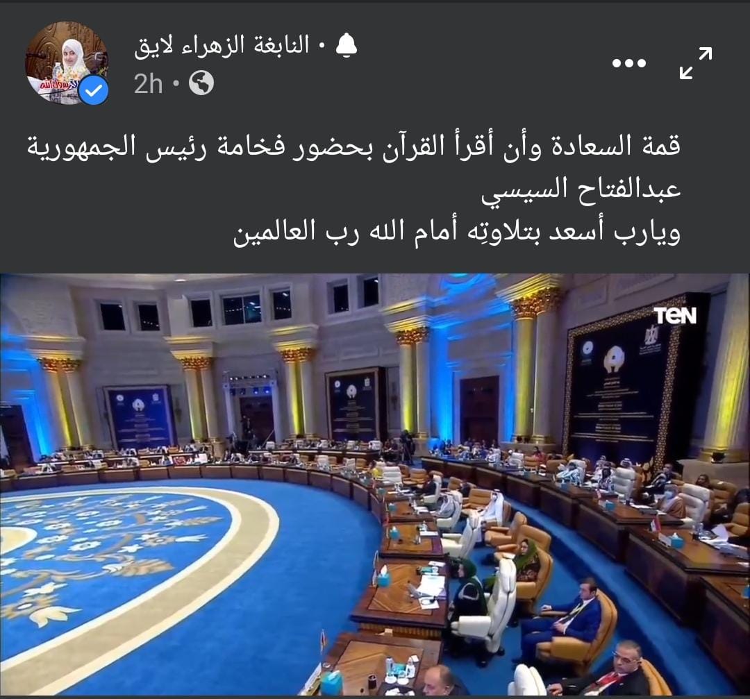 عبرت الزهراء لايق، عن سعادتها وفخرها لتلاوة القرآن الكريم، أمام الرئيس عبد الفتاح السيسي، في الجلسة الافتتاحية للمؤتمر الوزاري الثامن لمنظمة التعاون الإسلامي الخاص بالمرأة.