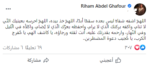 وكتبت ريهام عبد الغفور منشورًا، عبر حسابها الرسمي بموقع التواصل الاجتماعي "فيس بوك"، جاء فيه: "اللهمّ اشفه شفاءً ليس بعده سقمًا أبدًا، اللهمّ خذ بيده، اللهمّ احرسه بعينيك التّي لا تنام".