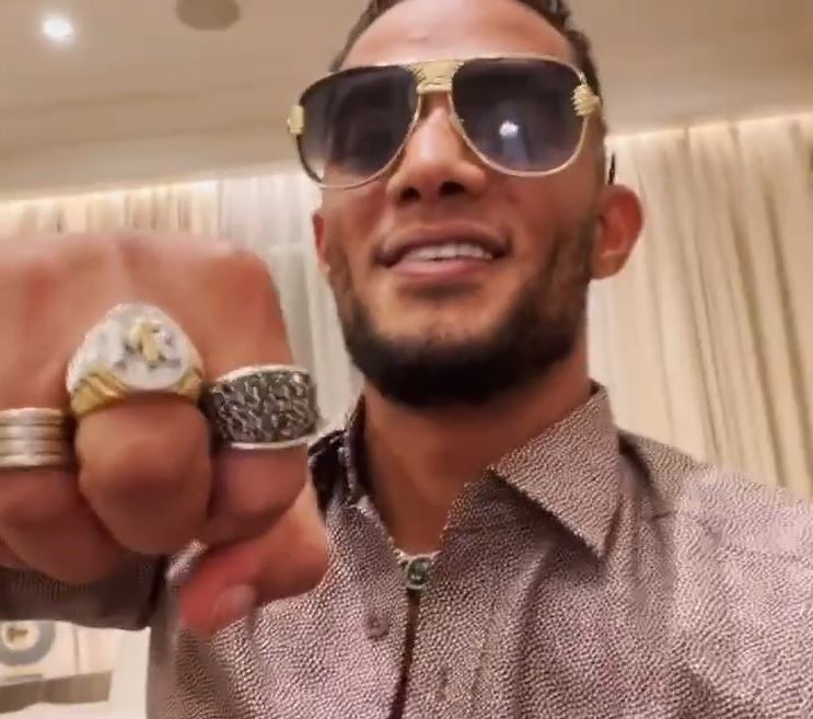 واستعرض محمد رمضان الهدية وهي عبارة عن خاتم مكتوب عليه حرفين (MR) اختصارًا لاسمه، موجهًا الشكر إلى عبدالله سكجها على هديته القيمة وتقديره له.