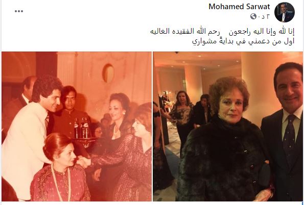 ونشر محمد ثروت صورتين تجمعه بها عبر حسابه الرسمي بموقع التواصل الاجتماعي “فيس بوك”، وقال: “إنا لله وإنا إليه راجعون رحم الله الفقيدة الغالية، أول من دعمني في بداية مشواري”.