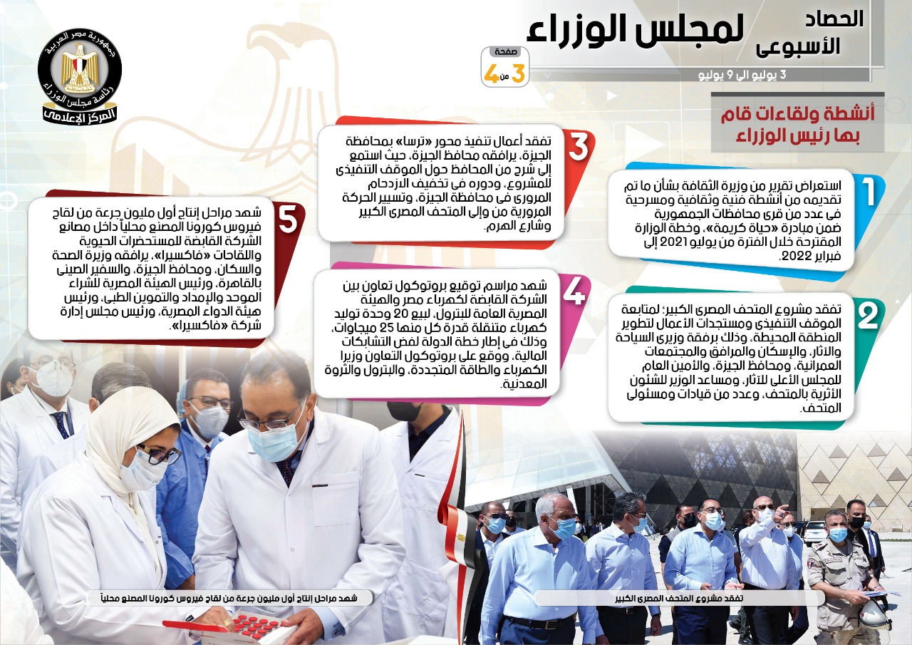 وحول الأنشطة التي قام بها رئيس مجلس الوزراء، فقد شملت استعراض تقرير من وزيرة الثقافة بشأن ما تم تقديمه من أنشطة فنية وثقافية ومسرحية في عدد من قرى محافظات الجمهورية ضمن مبادرة "حياة كريمة"، وخطة الوزارة المقترحة خلال الفترة من يوليو 2021 إلى فبراير 2022، كما تفقد مشروع المتحف المصري الكبير؛ لمتابعة الموقف التنفيذي ومستجدات الأعمال لتطوير المنطقة المحيطة، وذلك برفقة وزيري السياحة والآثار، الإسكان والمرافق والمجتمعات العمرانية، محافظ الجيزة، الأمين العام للمجلس الأعلى للآثار، مساعد الوزير للشئون الأثرية بالمتحف، وعدد من قيادات ومسئولي المتحف، بالإضافة إلى تفقد أعمال تنفيذ محور "ترسا" بمحافظة الجيزة، يرافقه محافظ الجيزة، حيث استمع إلى شرح من المحافظ حول الموقف التنفيذي للمشروع، ودوره في تخفيف الازدحام المروري في محافظة الجيزة، وتسيير الحركة المرورية من وإلى المتحف المصري الكبير وشارع الهرم، في حين شهد مراحل إنتاج أول مليون جرعة من لقاح فيروس كورونا المصنع محليًا داخل مصانع الشركة القابضة للمستحضرات الحيوية واللقاحات "فاكسيرا"، يرافقه وزيرة الصحة والسكان، ومحافظ الجيزة، والسفير الصيني بالقاهرة، ورئيس الهيئة المصرية للشراء الموحد والإمداد والتموين الطبي، ورئيس هيئة الدواء المصرية، ورئيس مجلس إدارة شركة "فاكسيرا".