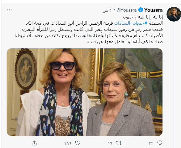 وكتبت يسرا في منشورها: “إنا لله وإنا إليه راجعون السيدة جيهان السادات قرينة الرئيس الراحل أنور السادات في ذمة الله،