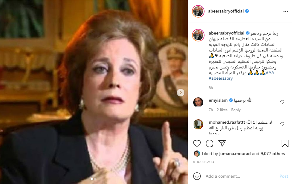 وكتبت عبير في منشورها: “ربنا يرحم ويعفو عن السيدة العظيمة الفاضلة جيهان السادات كانت مثالا رائعا للزوجة القوية المثقفة المحبة، لزوجها الزعيم أنور السادات ودعمته في كل ظروف حياته الصعبة”.