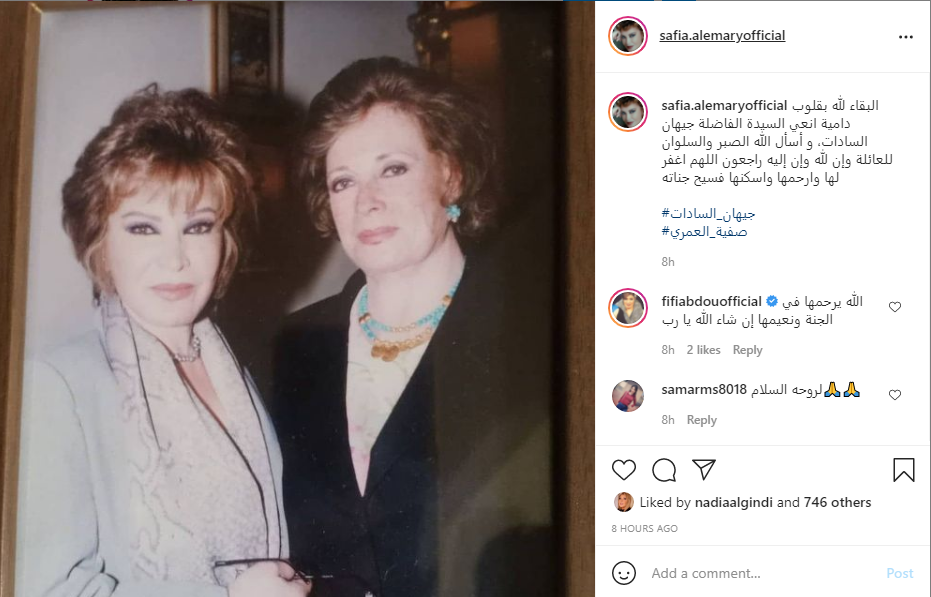 كما نشرت نبيلة عبيد، صورة للراحلة عبر حسابها الخاص بموقع الصور والفيديوهات “انستجرام”، معلقة: “بكل الحزن والأسى أنعى رحيل السيدة العظيمة جيهان السادات، وعظم الله أجرها على ما قدمت لمصر خلال حرب أكتوبر، البقاء لله وإنا لله وإنا إليه راجعون”.