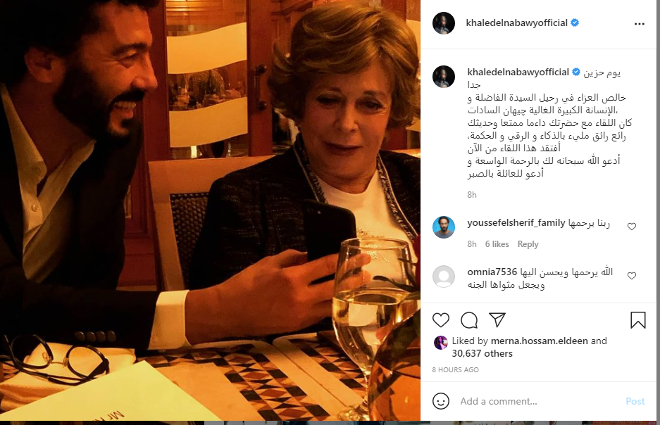 وعبر الفنان خالد النبوي، عن حزن الشديد لرحيل السيدة جيهان السادات وكتب في منشوره: “يوم حزين جدًا.. خالص العزاء في رحيل السيدة الفاضلة والإنسانة الكبيرة الغالية جيهان السادات”.