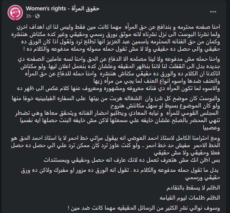 وقالت إدارة صفحة "حقوق المرأة" في منشور لها للرد على العوضي: إحنا صفحة محترمة وبندافع عن حق المرأة، مهما كانت مين فقط وليس لنا أي أهداف اخري ولما نشرنا البوست اللى نزل نشرناه لأنه موثق بورق رسمي وحقيقي وغير كدة مكناش هننشره، وكمان من حق الفنانة المحترمة ياسمين عبد العزيز إنه ا تطلع ترد وتقول إذا كان الورق ده حقيقي واللى حصل ده حقيقي ولا لأ، مش تقول حملة ممولة وحملة مدفوعة والكلام ده !