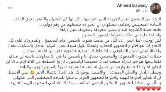 واختتم: “فها هو خبر نشرته صفحة أعدت خصيصًا لياسمين، تاريخ الصفحة من ثلاثة أيام، أنا لن أتجاوز احتراما للجميع، وأرجو من تسول له لنفسه لتشويه صورة ياسمين، الهدوء والراحة، ونبطل اللجان واللجان المضادة، والأفضل توفير كل هذا المال لأعمال الخير”.