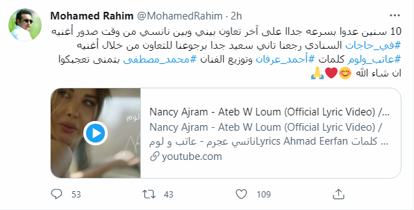 وكتب رحيم تغريدة، عبر حسابه الرسمي بموقع التدوينات القصيرة "تويتر"، مغردًا: "10 سنين عدوا بسرعه جدًا على آخر تعاون بيني وبين نانسي من وقت صدور أغنية في حاجات، السنادي رجعنا تاني سعيد جدًا برجوعنا للتعاون من خلال أغنية عاتب ولوم، كلمات أحمد عرفان، وتوزيع الفنان محمد مصطفى، بتمنى تعجبكوا إن شاء الله".