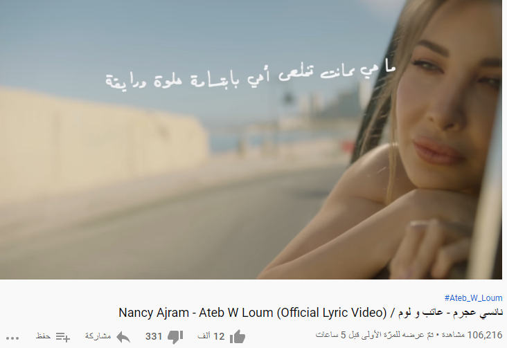 حققت أغنية "عاتب ولوم" لنانسي عجرم أكثر من 100 ألف مشاهدة بعد ساعات من طرحها، عبر موقع الفيديوهات الشهير "يوتيوب".