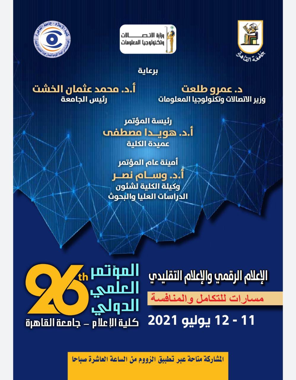 بدأ المؤتمر العلمي الدولي لكلية الإعلام بجامعة القاهرة، اليوم الأحد، عبر تطبيق زووم، ويستمر حتى غدًا الاثنين، ويتناول خلال جلساته "الإعلام الرقمي والإعلام التقليدي"، تحت إشراف الدكتور عمرو طلعت وزير الاتصالات وتكنولوجيا المعلومات، الدكتور محمد عثمان الخشت، رئيس الجامعة، والدكتورة هويدا مصطفى، عميدة الكلية ورئيسة المؤتمر، والدكتورة وسام نصر وكيلة الكلية لشئون الدراسات العليا والبحوث.