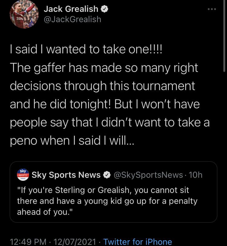 وقال “جريليش” عبر حسابه الشخصي على موقع التواصل الاجتماعي "تويتر" ردًا على قصة خبرية من شبكة "سكاي سبورتس"؛ تتهمه برفض تسديد الركلة الترجيحية: "لقد قلت أنني أريد تسديد ركلة جزاء، المدرب اتخذ العديد من القرارات الصحيحة في البطولة".