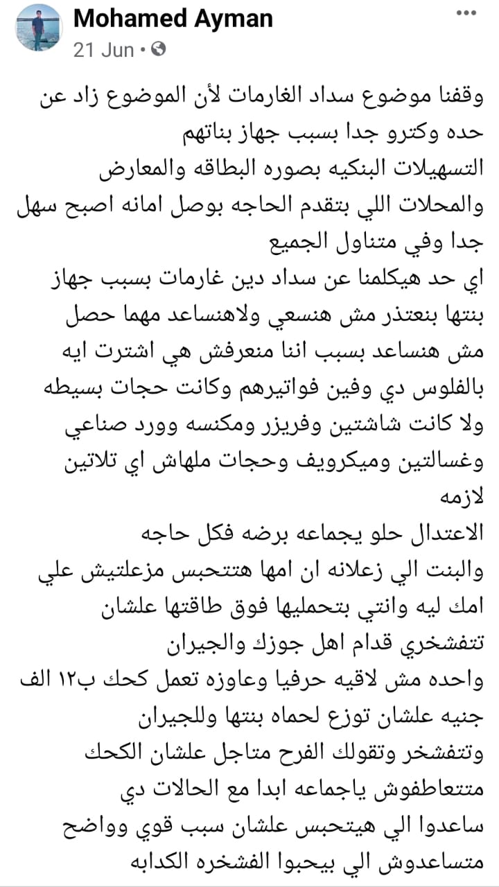 وقال أيمن: “إن هذا الموضوع تطور في الأرياف ووصل إلى أن تشتري الأم ذات الأجهزة لنفسها عند شرائها لابنتها، وأحيانًا تلجأ لأكثر من جمعية في ذات الوقت، وبعد ما توفر لها كل جمعية ما تحتاجه تأخذ لنفسها ما تحتاجه أو تبيعه للربح”، قائلًا:"هناك أم طالبت 3 جمعيات مختلفة بتوفير ما تحتاجه ابنتها في الزواج".