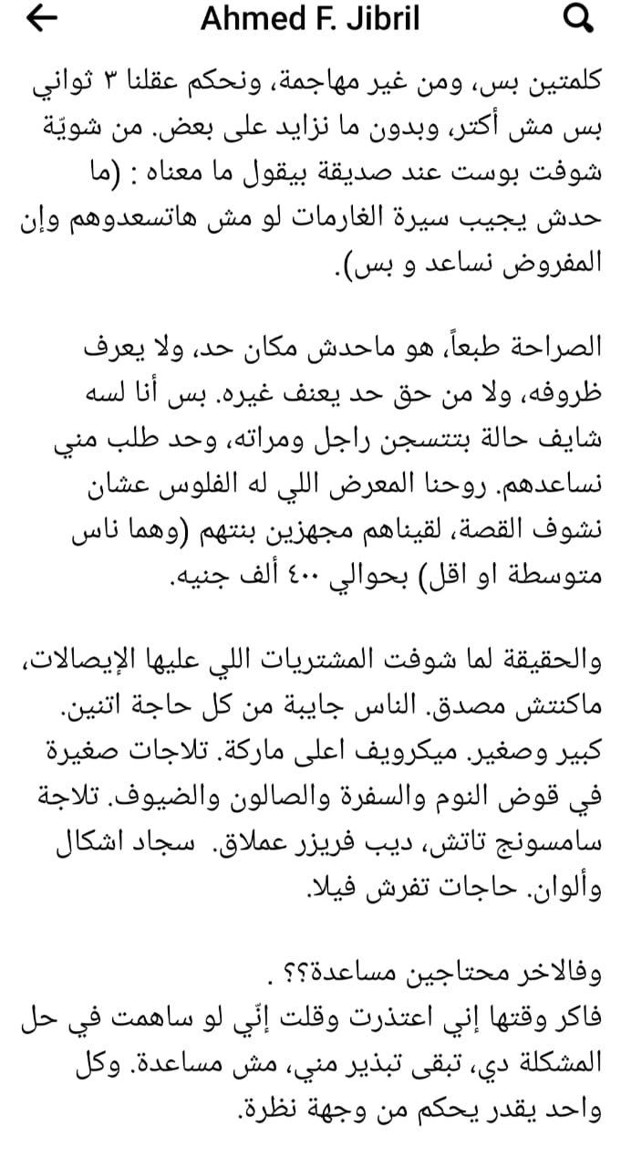 واستطرد أحمد جبريل أنه عندما كتب منشورًا لمساعدة إحدى السيدات التي لجأت إليه لسداد دين ورطها به زوجها بمبلغ 40 ألف جنيه، فوجئ أن خانة الرسائل الخاصة به تحولت كلها إلى رسائل لأشخاص يطالبونه بجمع تبرعات لسداد ديونهم التي وصلت بعضها إلى 300 ألف جنيه، مردفًا: “هؤلاء لسن غارمات”.