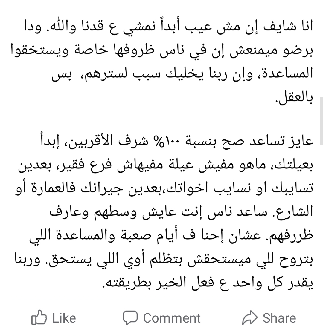وأوضح في تعليقه: “أن السوشيال ميديا ليست مكانًا لجمع التبرعات ومن أراد عمل الخير إما أن يكون على نفقته الشخصية وإذا كان غير مقتدر يكون عبر مطالبة أصدقائه أو معارفه بمشاركته به”، لافتًا إلى أنه يجب أن يكون هناك تكافل إجتماعي وعائلي حيث يتبرع الأشخاص المقتدرين ماليًا في كل عائلة لتحمل نفقات غير المقتدرين منهم.