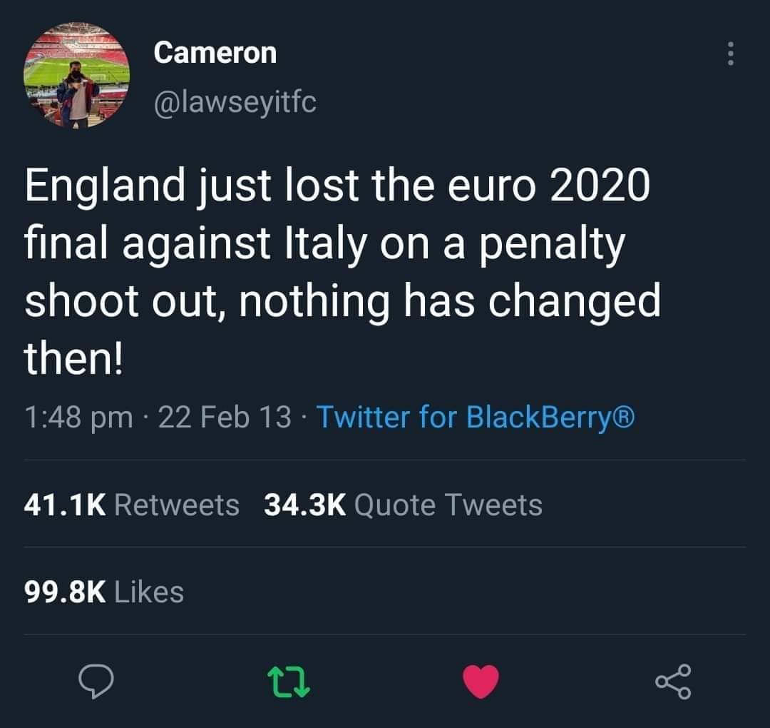 كتب رجل بريطاني صاحب حساب Cameron @lawseyitfc، تغريدة عام 2013 بواسطة هاتف قديم "بلاك بيري"، توقع فيها فوز منتخب إيطاليا بضربات الترجيح على منتخب إنجلترا، كما توقع نهائي بطولة الأمم الأوروبية 2020.