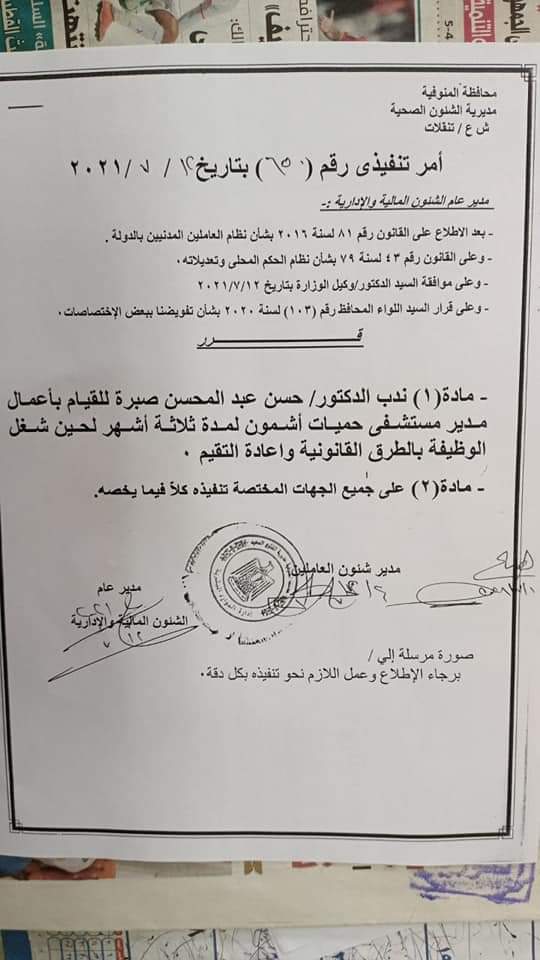 وكان الدكتور فيصل جودة، وكيل صحة المنوفية، قد أعلن عن صدور قرار بانتداب كلٍّ من الدكتور محمد سلامة عبد الحكيم، مدير مستشفى حميات أشمون للقيام بأعمال مدير مستشفى حميات منوف، والدكتور طارق أحمد نصار لانتدابه مديرًا لمستشفى تلا المركزي.
