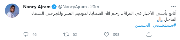 وكتبت نانسي تغريدة، عبر حسابها بموقع التدوينات القصيرة "تويتر": "أتابع بأسى الأخبار في العراق.. رحم الله الضحايا، لذويهم الصبر، وللجرحى الشفاء العاجل".