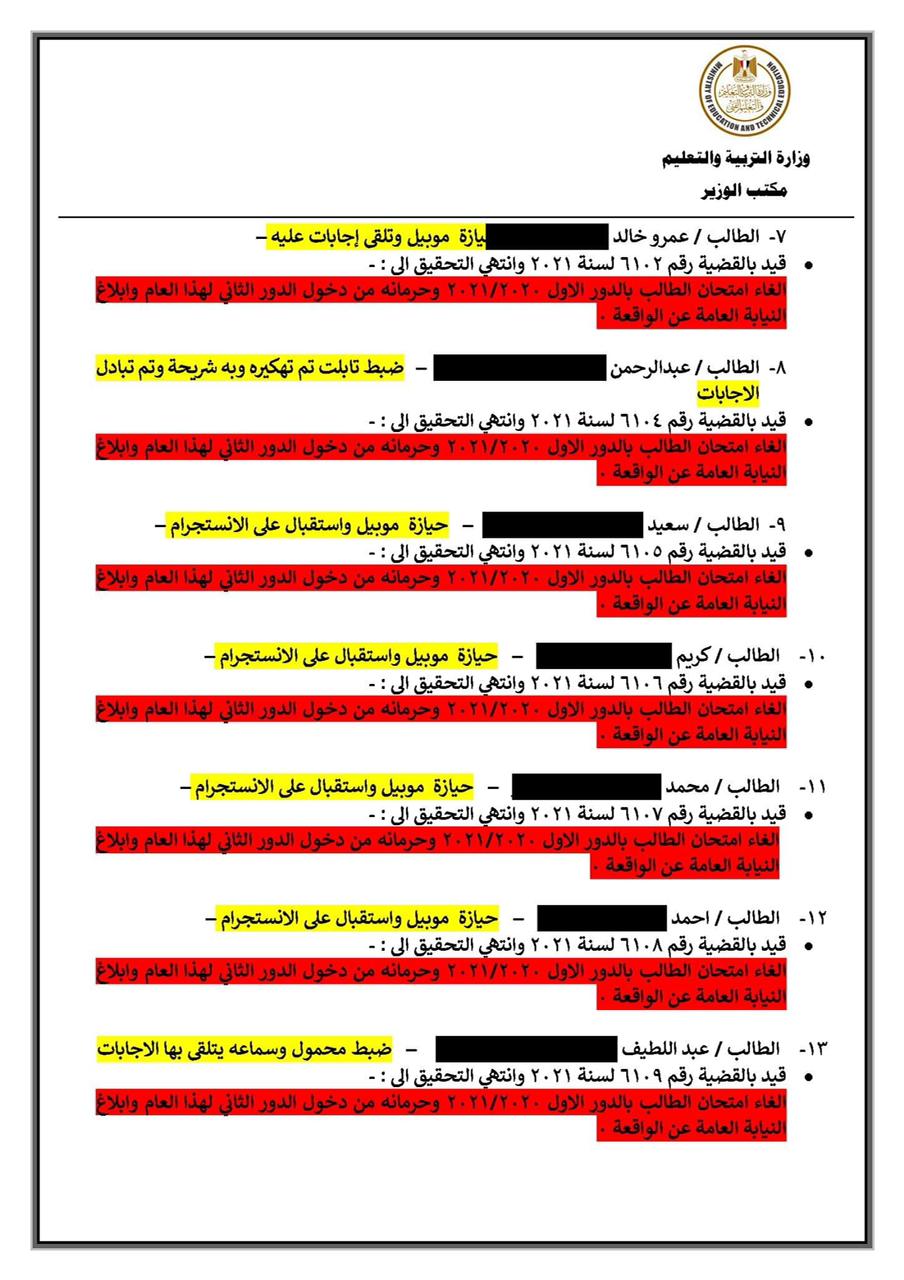 وكشف شوقي، عبر صفحته الرسمية على موقع التواصل الاجتماعي "فيس بوك"، أسماء الطلاب والعقوبات التي تم توقيعها عليهم.