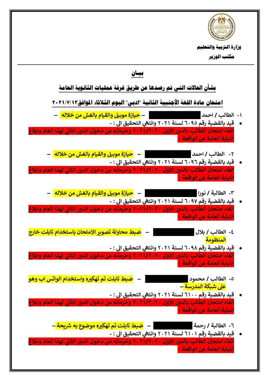 نشر الدكتور طارق شوقي، وزير التربية والتعليم، بيان بشأن الحالات التي تم رصدها عن طريق غرفة عمليات الثانوية العامة اليوم الثلاثاء.