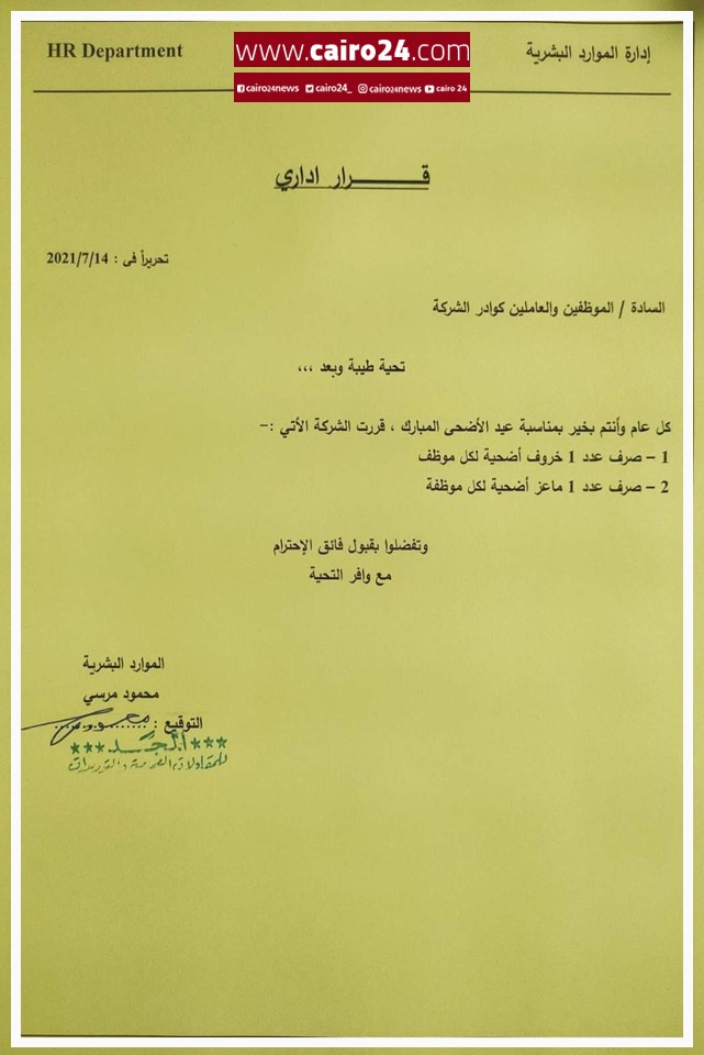 تداول مستخدمو مواقع التواصل الاجتماعي، قرارا إداريا لإحدى الشركات، تهنيء فيه موظفيها بعيد الأضحى المبارك، ولكن بطريقتها الخاصة.