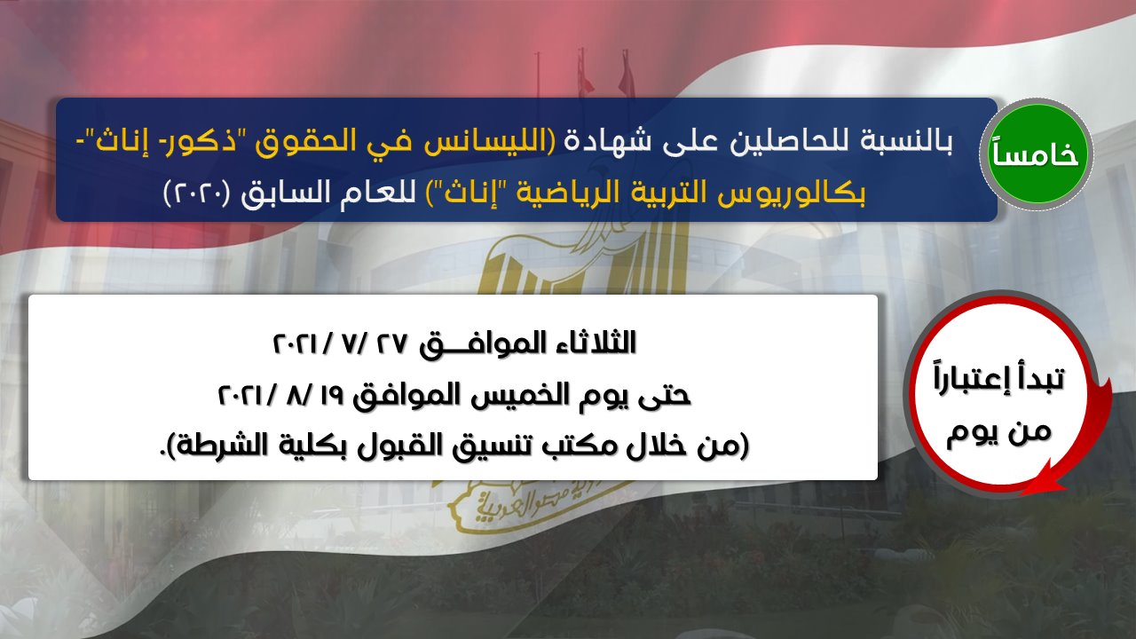 واستطرد رئيس أكاديمية الشرطة، أن التقديم لحاملي درجة الليسانس من كلية الحقوق ذكور وإناث العام السابق 2020، سيبدأ من 27 يوليو الجاري حتى 19 أغسطس المقبل، فضلًا عن حاملي شهادات كليات الحقوق ذكور وإناث وتربية رياضية للعام الحالي 2021 والحاصلين على المؤهلات الجامعية من بكالوريوس وليسانس وماجستير ودكتوراه سيكون بدءا من 21 أغسطس حتى 21 سبتمبر المقبل.