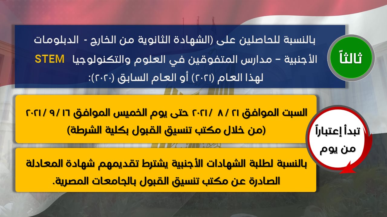 وافق اللواء محمود توفيق، وزير الداخلية، على قبول دفعة جديدة من الراغبين في الالتحاق بـ كلية الشرطة من الحاصلين على الثانوية العامة أو ما يعادلها أو شهادة إتمام الدراسة الثانوية التي تمنحها المعاهد الأزهرية الثانوية بحد أدنى مجموع 65%، لعامي 2020 و2021، وكذلك من الحاصلين على درجة الليسانس في الحقوق ذكور وإناث بحد أدنى تقدير مقبول لعام 2020، فضلًا عن قبول دفعة جديدة من الحاصلين على المؤهلات الجامعية في التخصصات التي تمثل احتياجا أساسيا لقطاعات وزارة الداخلية ذكور وإناث بحد أدنى تقدير جيد.