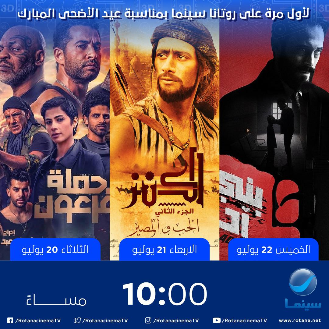 تعرض “روتانا سينما” لمشاهديها ثلاثة أفلام بعيد الأضحى، وهي من أقوى وأحدث إنتاجات السينما المصرية في أيام عيد الأضحى المبارك، حيث تقدم لهم أول أيام العيد مساء الثلاثاء 21 يوليو، الساعة العاشرة مساءً، فيلم "حملة فرعون" في عرضه الأول على الفضائيات العربية.